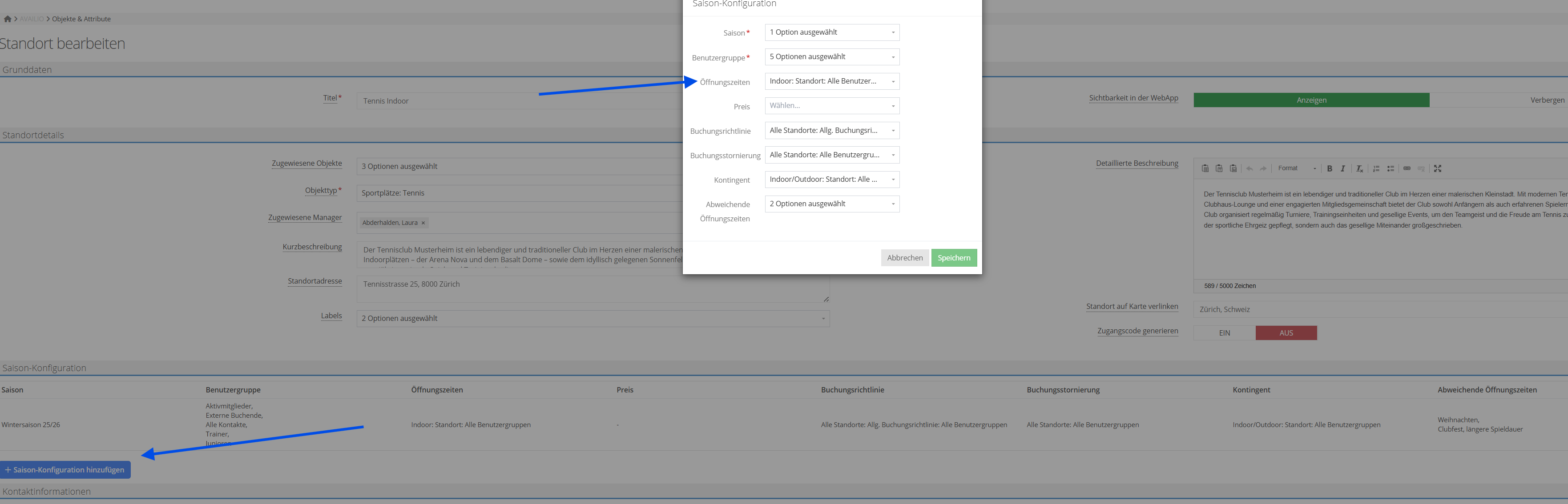 Gehen Sie danach auf die jeweils passende Ebene und fügen die Konfiguration direkt hinzu. So behalten Sie den Überblick. Natürlich können Sie für verschiedene Plätze, Standorte oder Benutzergruppen unterschiedliche Buchungsrichtlinien definieren.