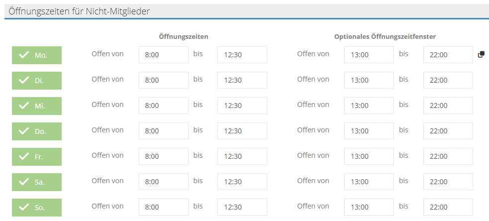 In den Buchungszeiten haben Sie die Möglichkeit, entweder eine oder zwei Buchungszeiten pro Tag zu bestimmen. Wenn Sie beispielsweise in Ihrem Verein eine Mittagspause haben, so können Sie auf diese Art und Weise Buchungen in der Mittagszeit deaktivieren.
