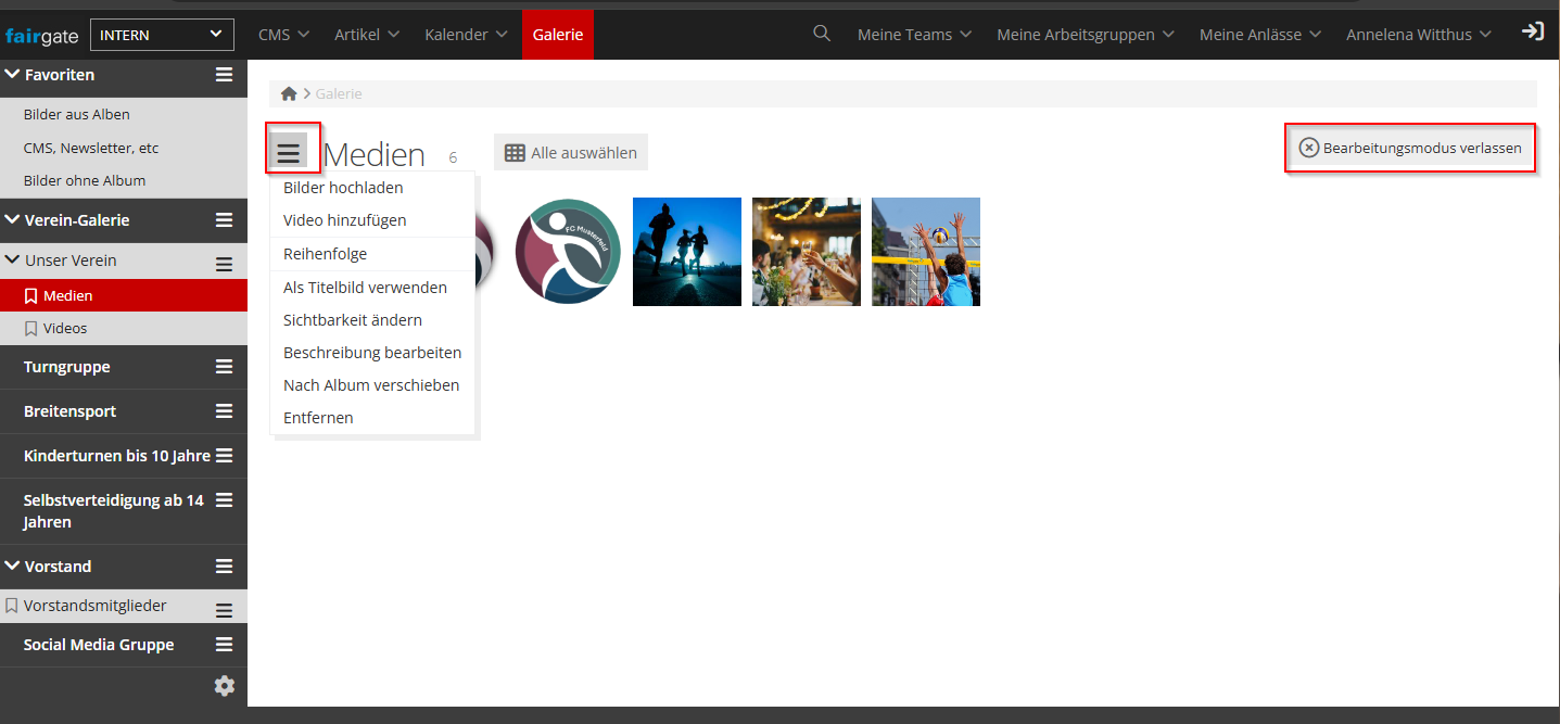 Zudem können Galerien Team- oder Gruppenspezifisch angelegt werden. Mitglieder von Teams oder Arbeitsgruppen können ebenfalls innerhalb Ihrer Galerien Bilder hinzufügen.