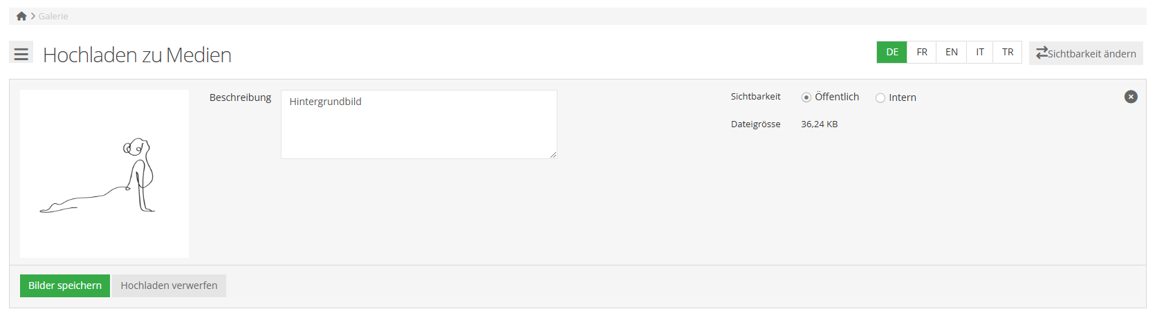 Wenn Sie ein neues Bild hochladen, können Sie eine Beschreibung hochladen und entscheiden, ob das Bild öffentlich (also: sichtbar auf der Webseite bei vorhandenem Webseiten-Modul) ist, oder nur intern