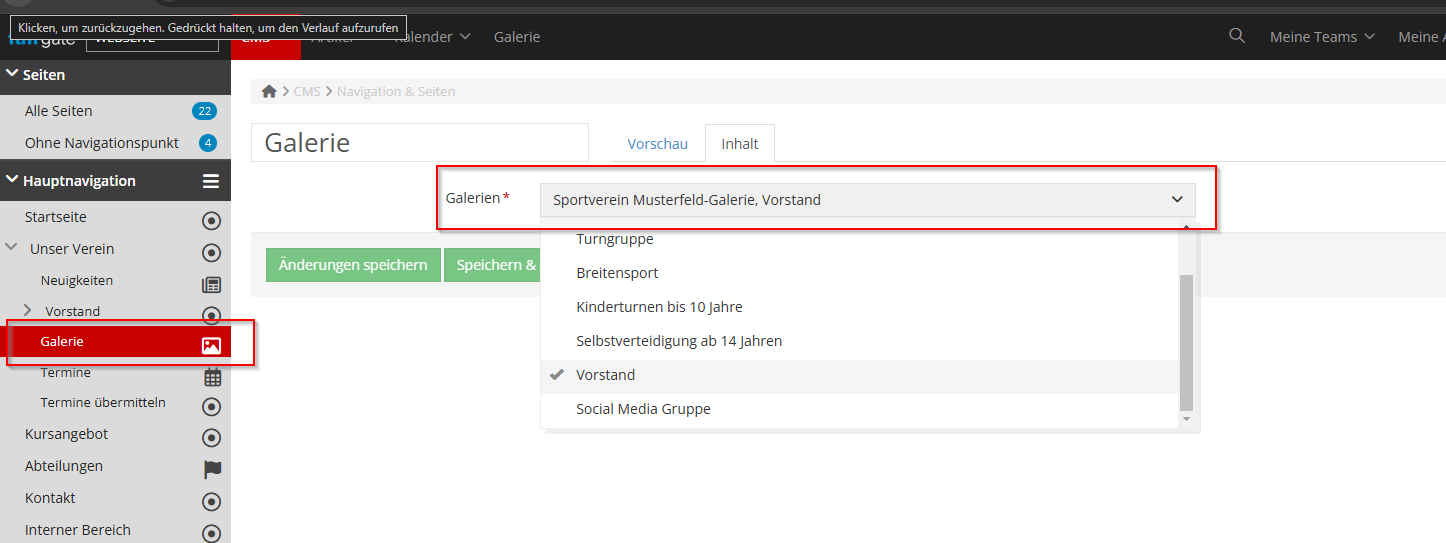 Wenn Sie das Webseiten-Modul gebucht haben, können Sie eine Spezialseite Galerie anlegen. Wählen Sie einfach über das Dropdownmenü die Galerien aus, die Sie anzeigen lassen möchten.