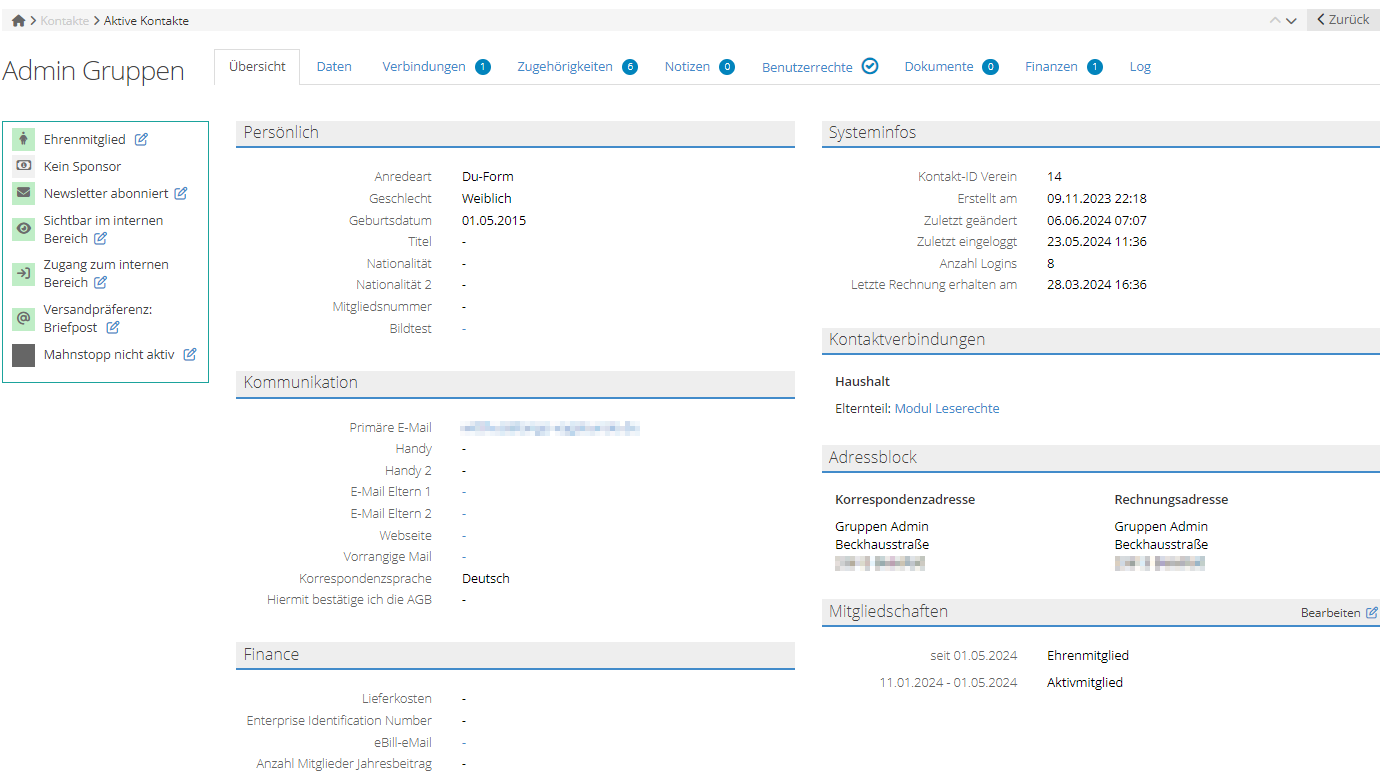 Die Kontaktübersichtsseite wird erreicht, wenn auf den Kontakt in der Kontakttabelle geklickt wird.