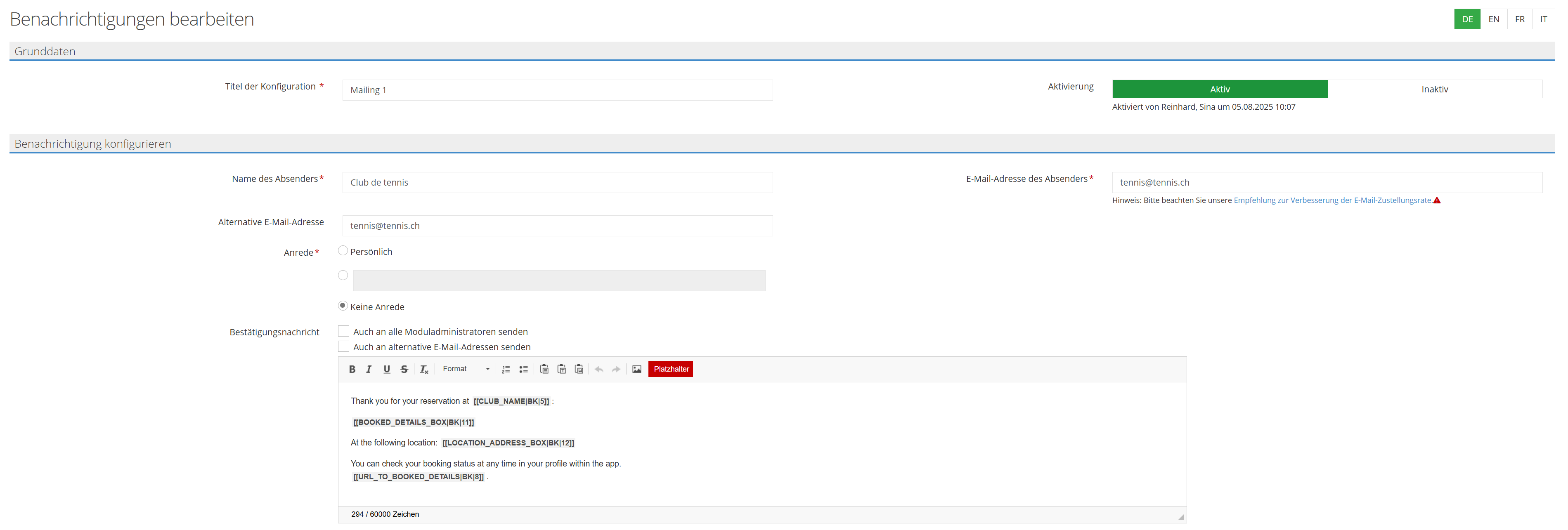 Die E-Mail-Benachrichtigungen können Sie bei Bedarf selbst versenden und inhaltlich anpassen. Standardmässig sind diese jedoch bereits so für Sie vorkonfiguriert, dass keine weiteren Anpassungen notwendig sind.