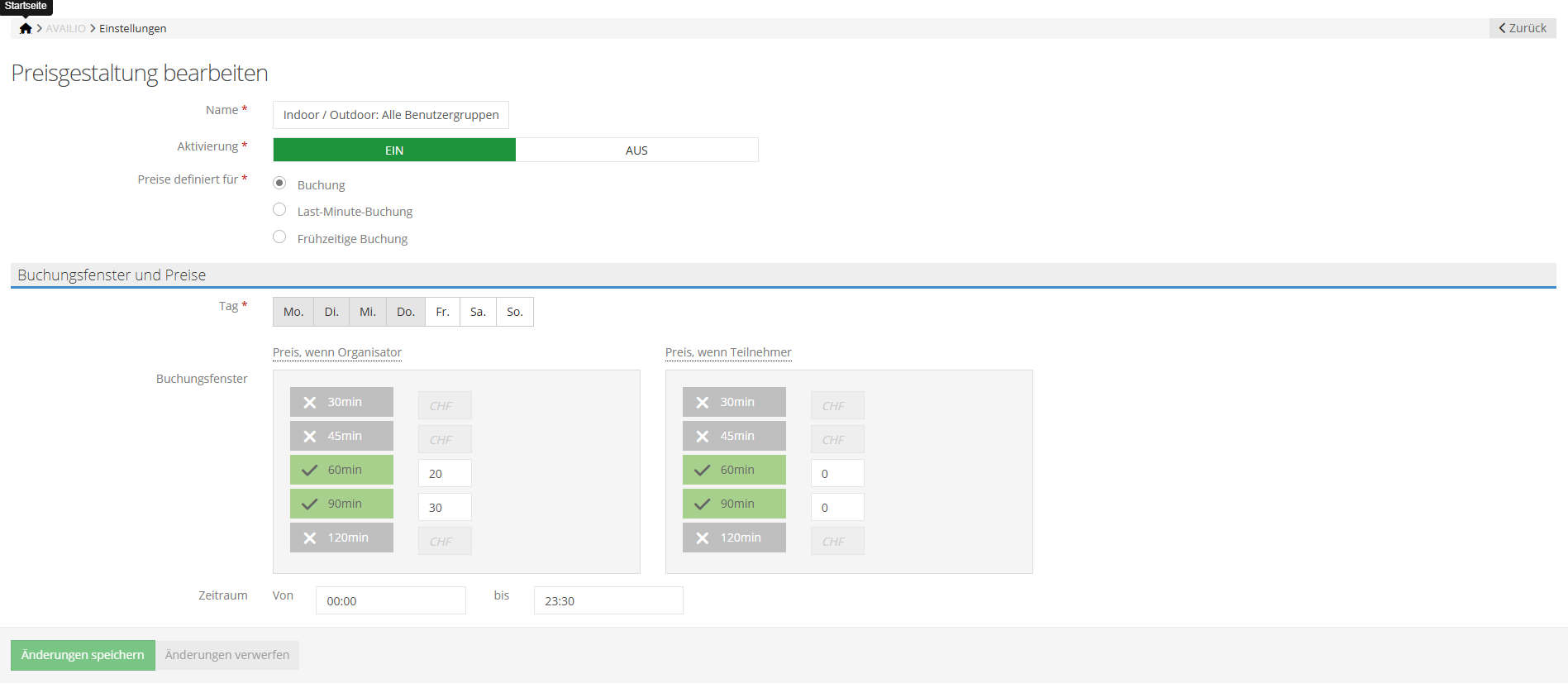 Legen Sie den Zeitraum fest, für welche diese Preisgestaltung gelten soll (z.B 08:00-16:00 Uhr)