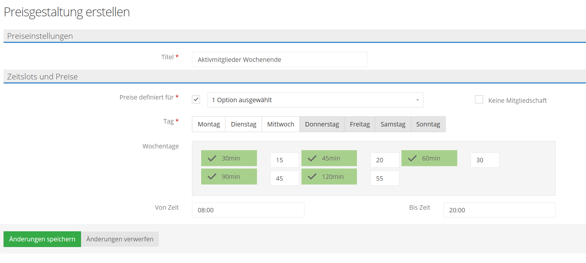 3. Wählen Sie die Tage aus, für welche die Preisgestaltung gelten soll