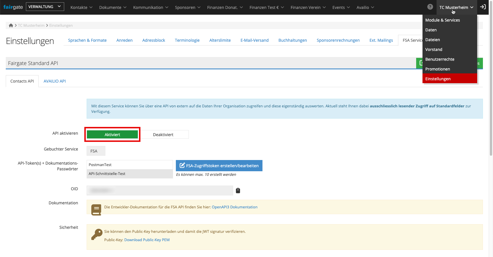 Nach erfolgreicher Buchung erscheint der Reiter FSA Service › Contacts API unter Einstellungen.