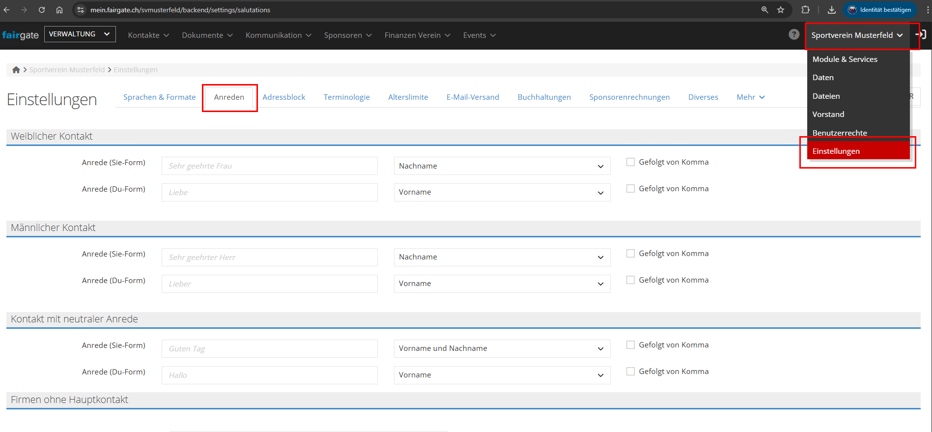 Anpassen der Anreden für alle Optionen in den Einstellungen
