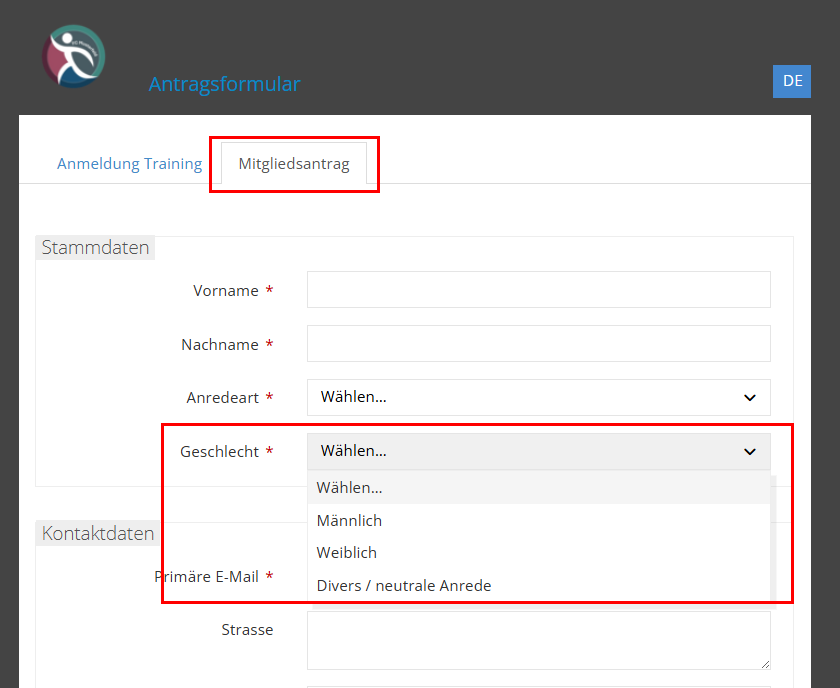 Allen Kontakten stehen dann alle drei Optionen zur Auswahl. Die Aktivierung der 3. Option findet auch Anwendung in Formularen, wo das Geschlecht abgefragt wird wie z.B. im Beitrittsgesuchformular oder in Eventformularen: