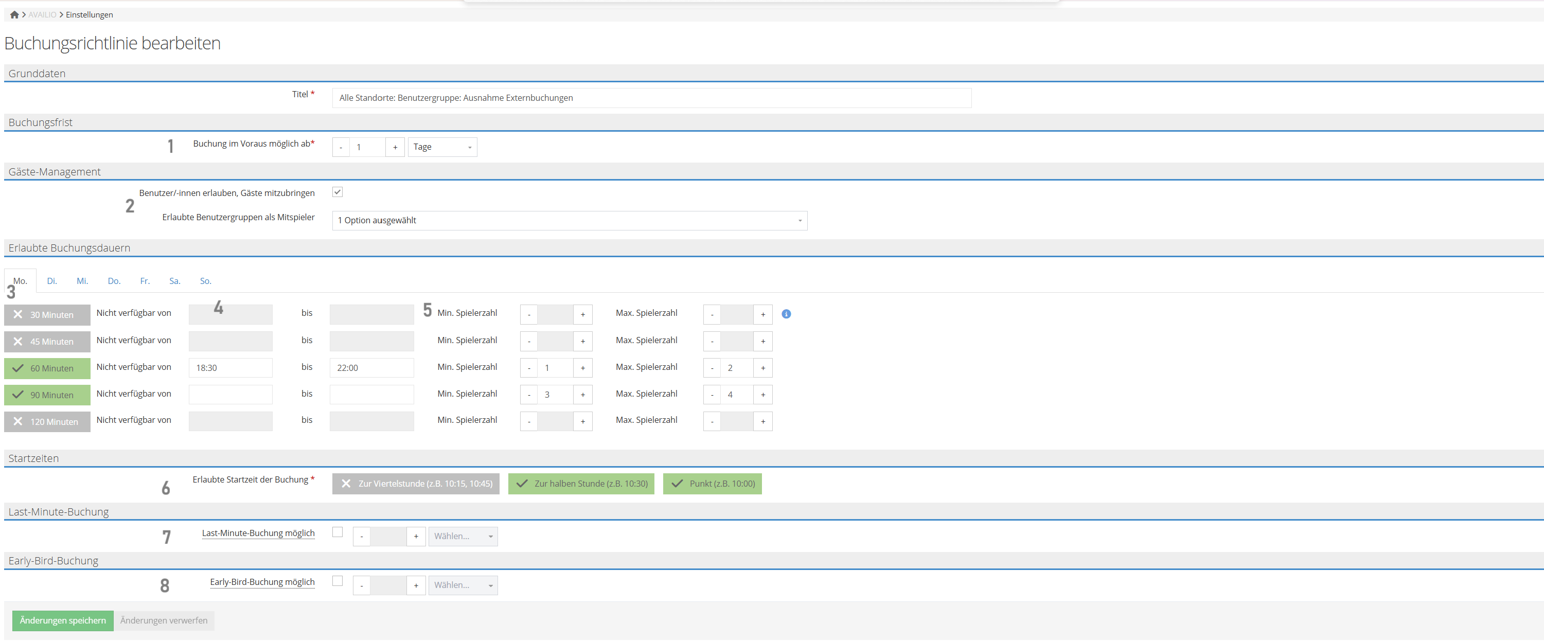 In den Buchungsrichtlinien in AVAILIO können Sie Gästeregelungen, Spieldauern, Startzeiten und vieles mehr bestimmen, und diese bestimmten Benutzergruppen, Objekten, Objektgruppen oder Standorten zuordnen.