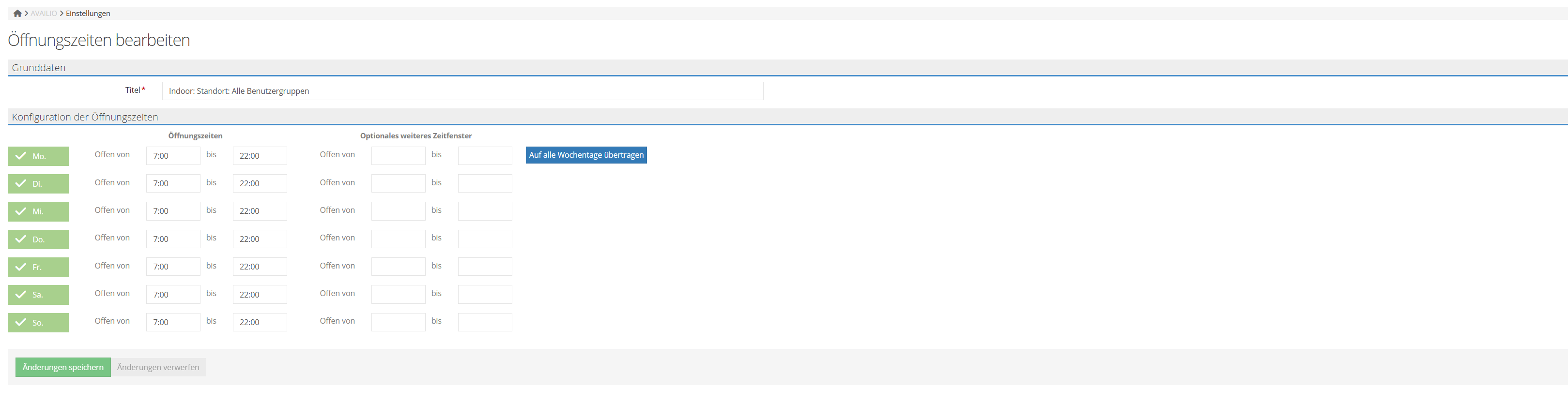 Wenn alle Wochentage dieselben Öffnungszeiten haben, klicken Sie darauf – die Zeiten vom Montag werden automatisch auf alle Tage übernommen.